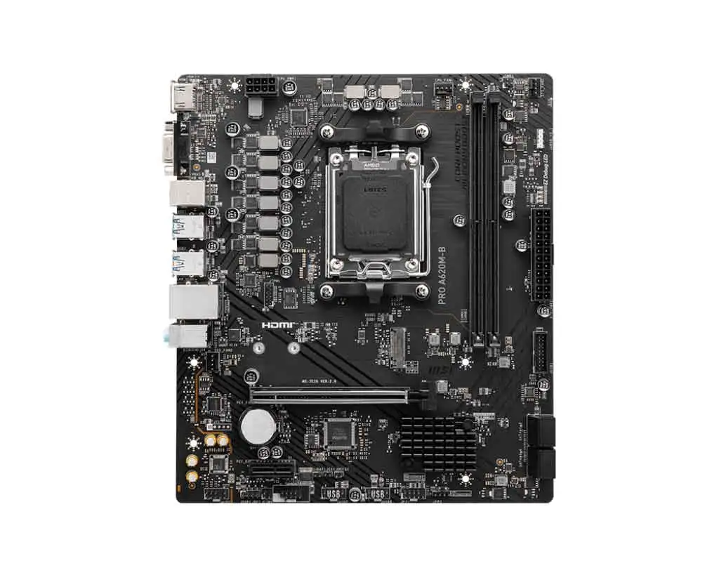 Buy MSI PRO A620M-B AM5 mATX Motherboard at the best price in Tech Moon BD. Supports Ryzen 9000/8000/7000, DDR5, PCIe 4.0 & M.2 NVMe SSD. it offers stability and performance at a great price in BD, perfect for budget gaming, office desktops, and student PCs.